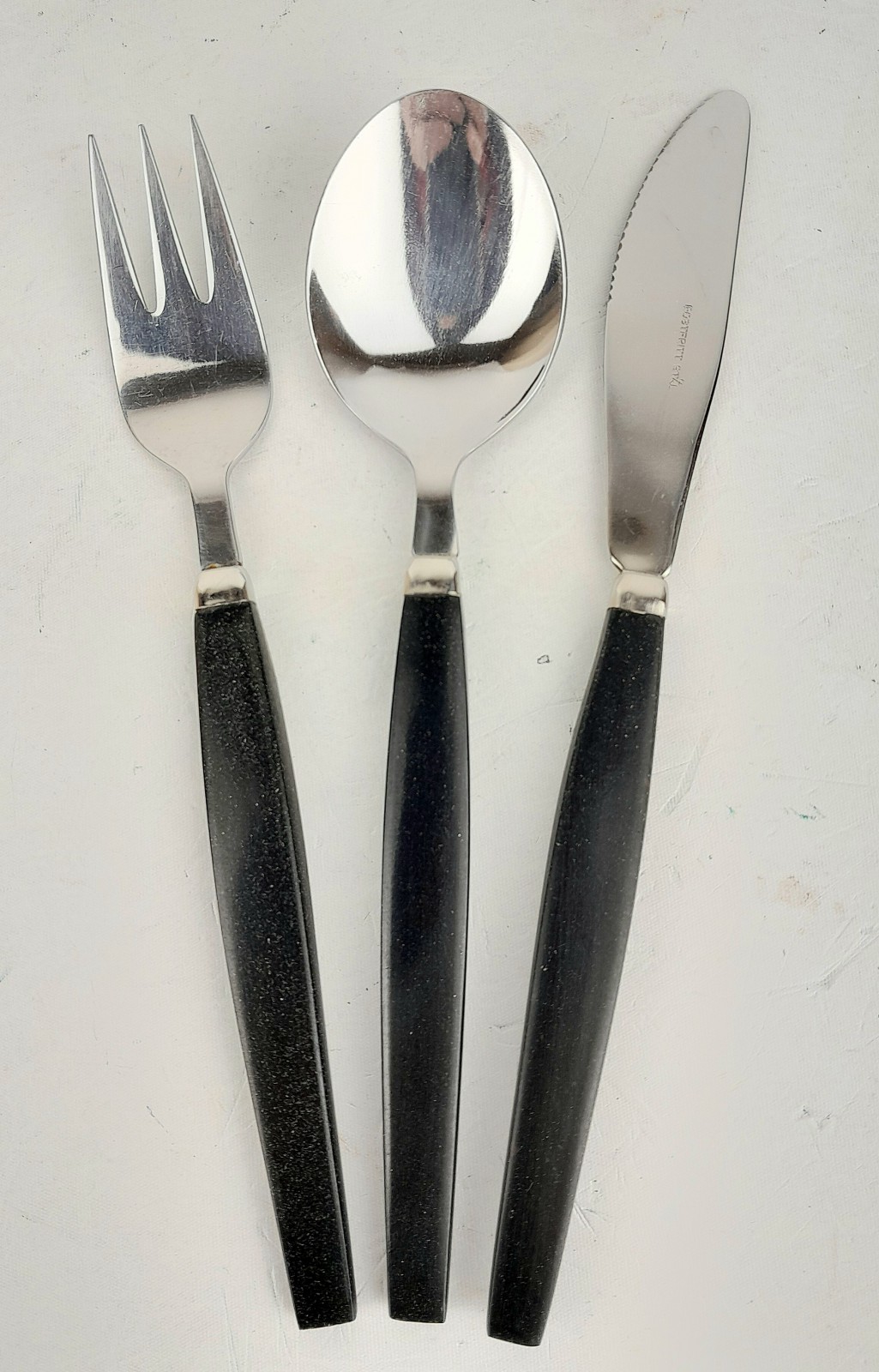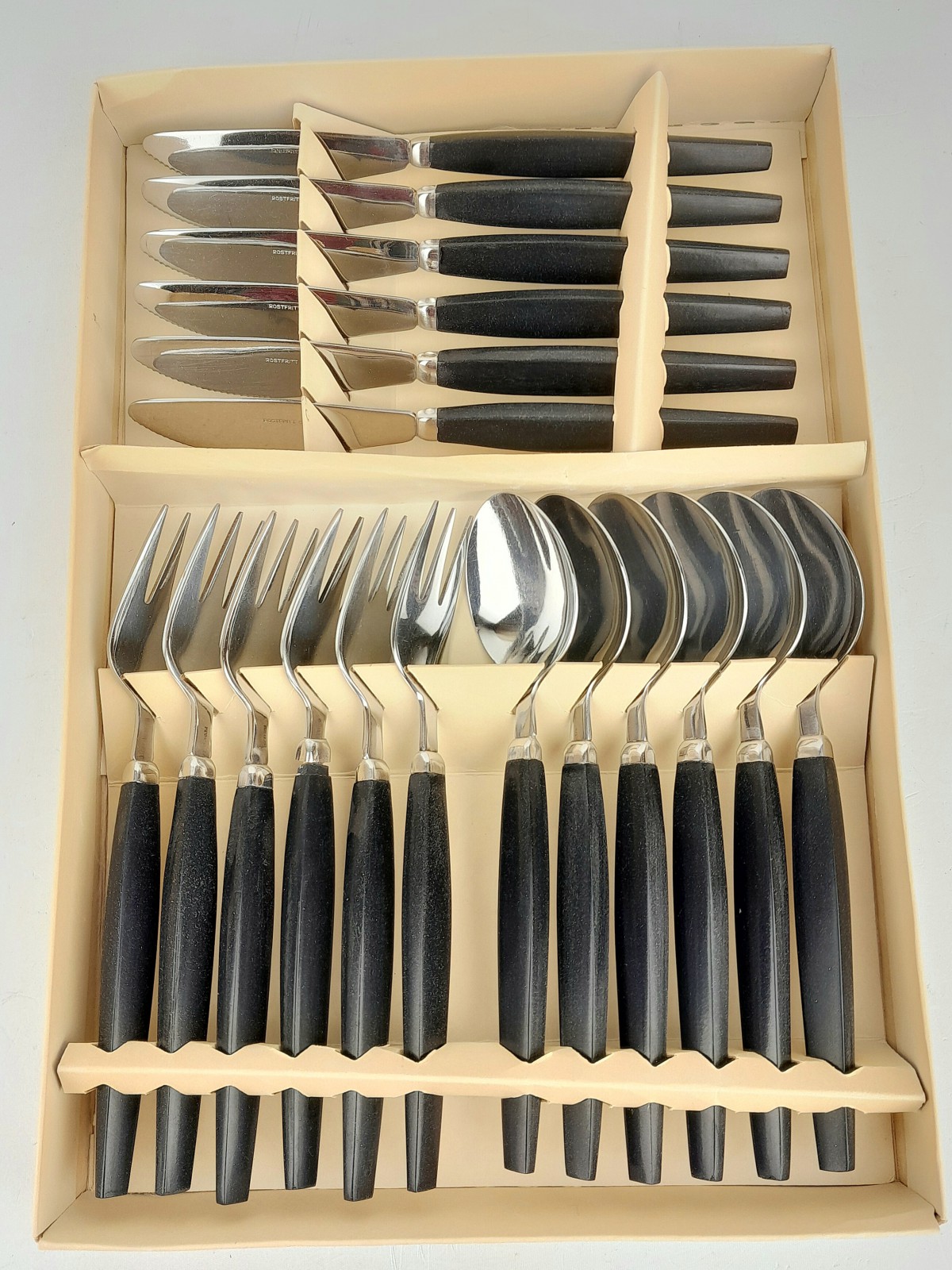 BESTICK MED BAKELITSKAFT, 1950-TAL Rostfritt stål, 6 gafflar, 6 skedar, 6 knivar, bruksskick, i orginalask Avslutas 2025-10-20 18:06:00