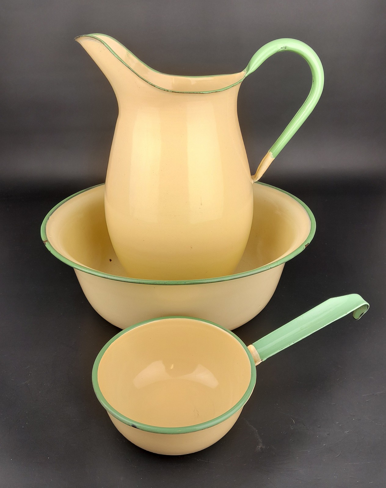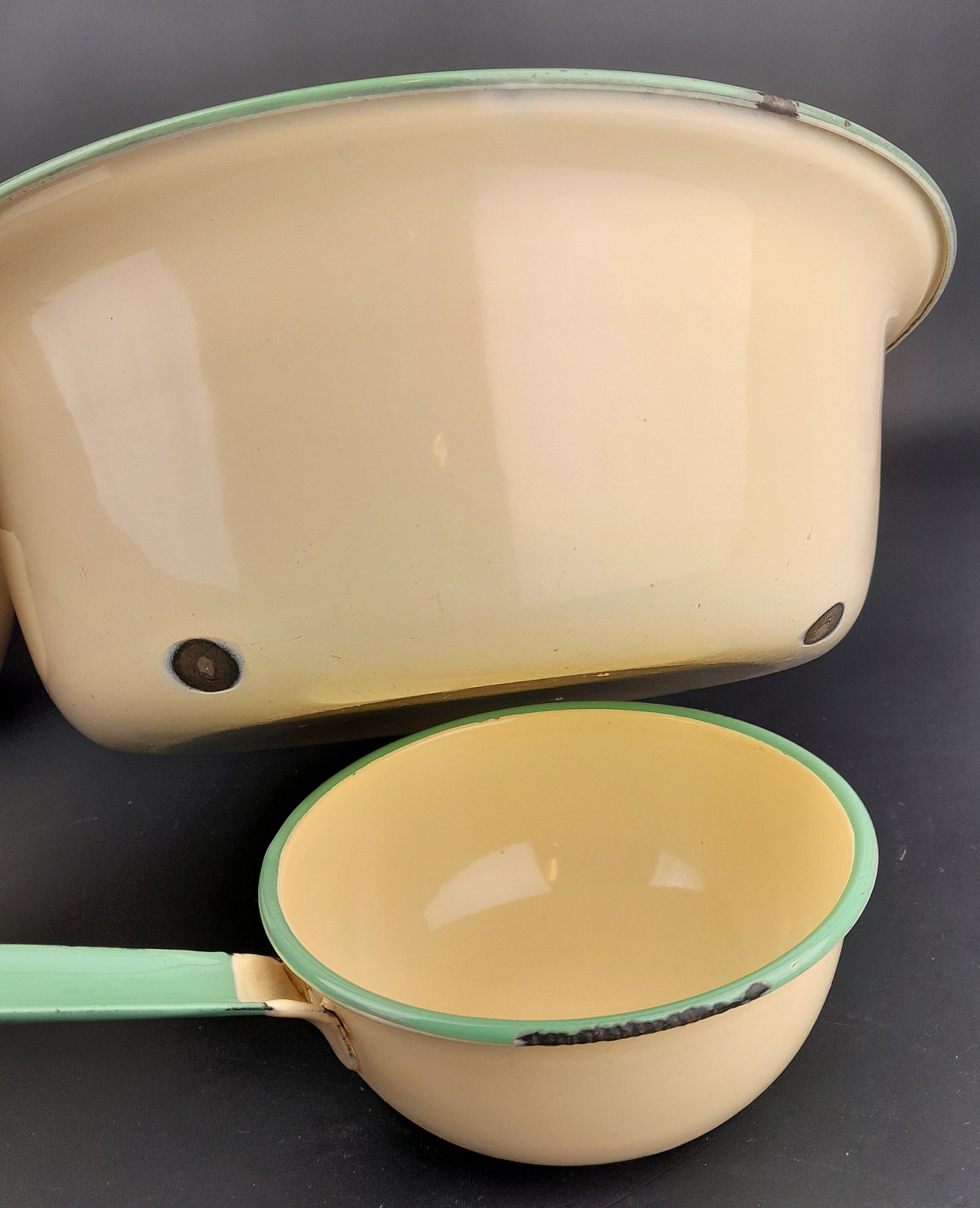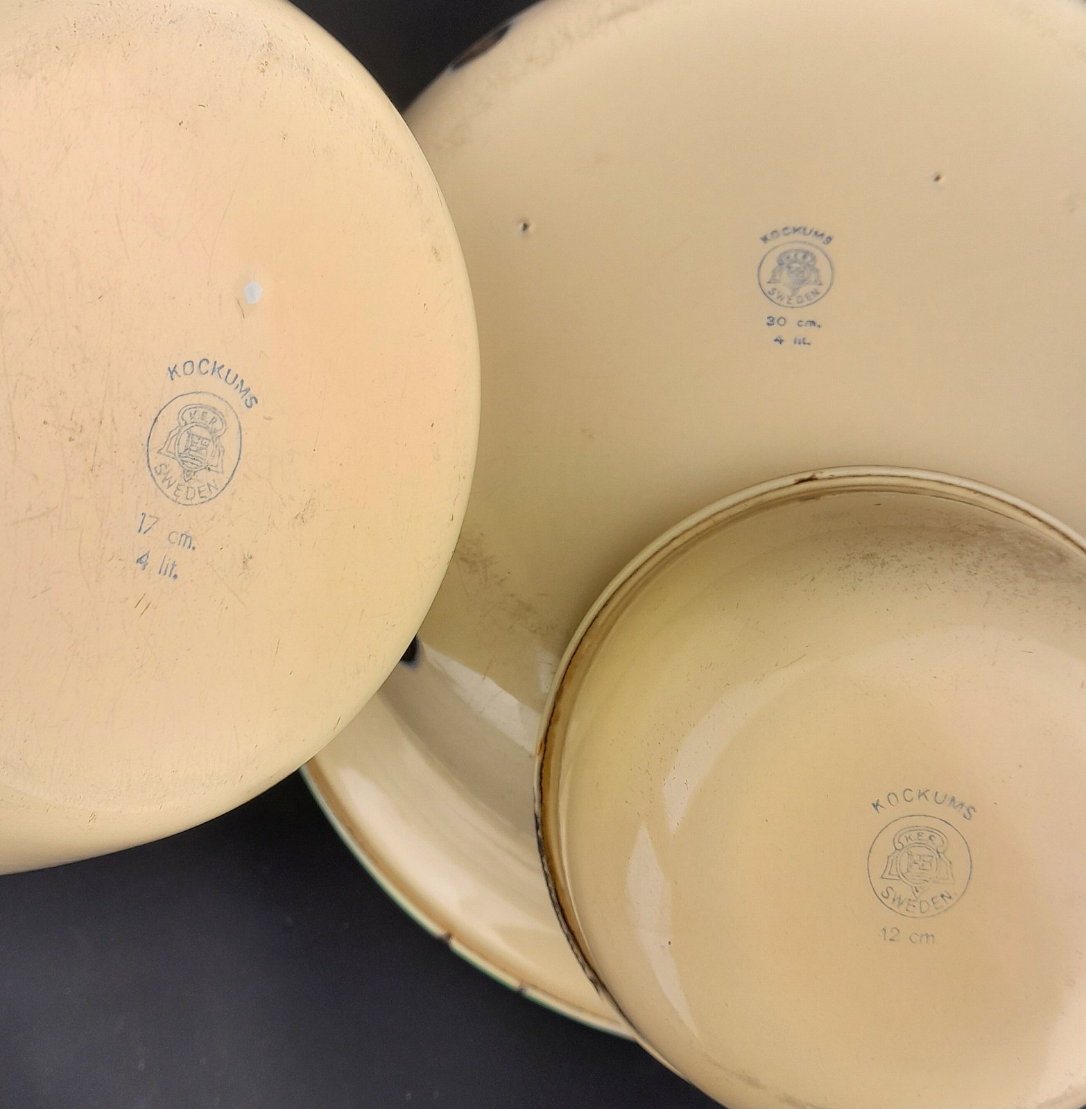 BALJA, SKOPA, KANNA, KOCKUM Balja diam 30 cm, några emaljskador Avslutas 2025-10-20 18:09:00