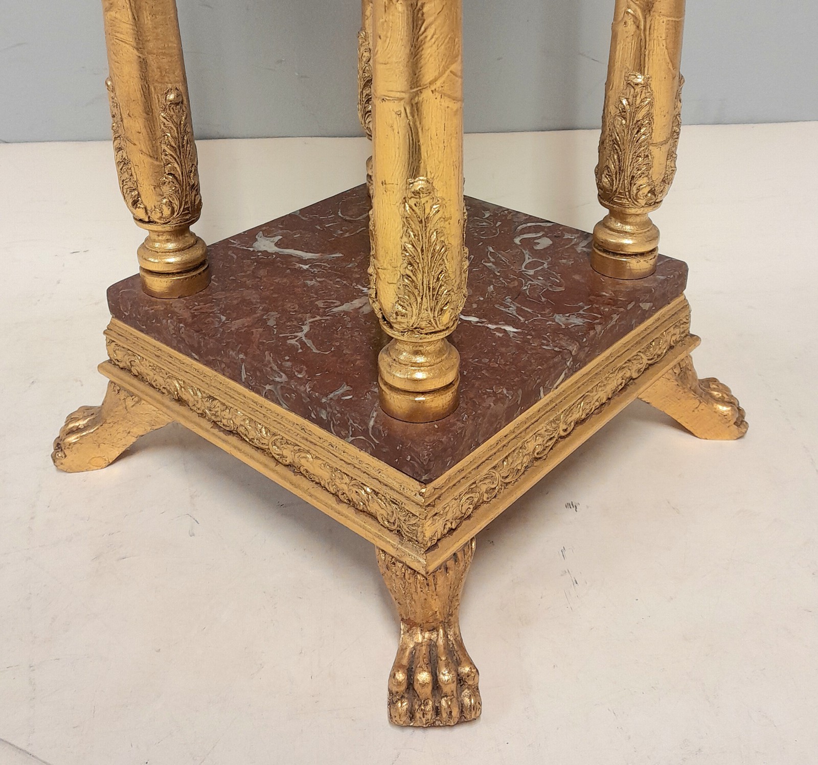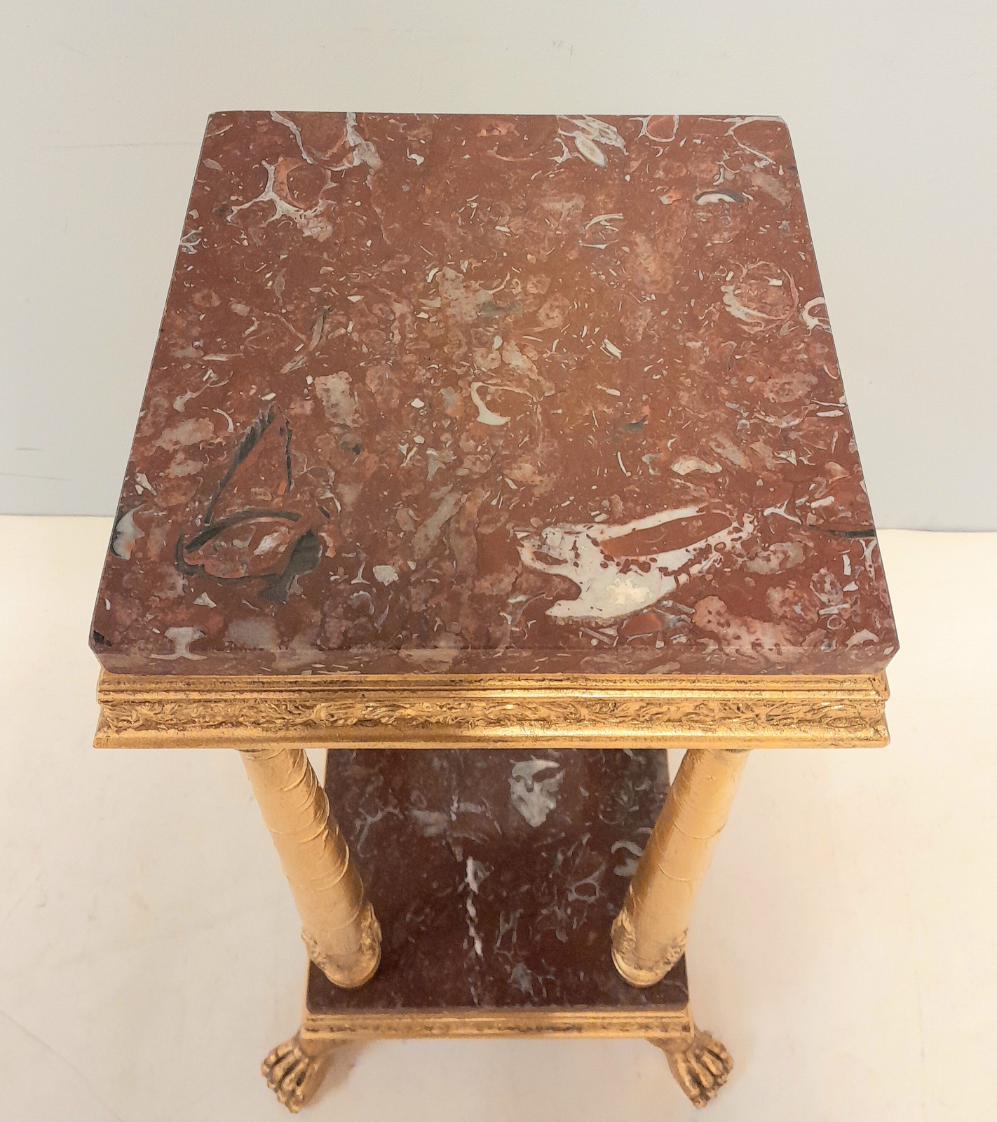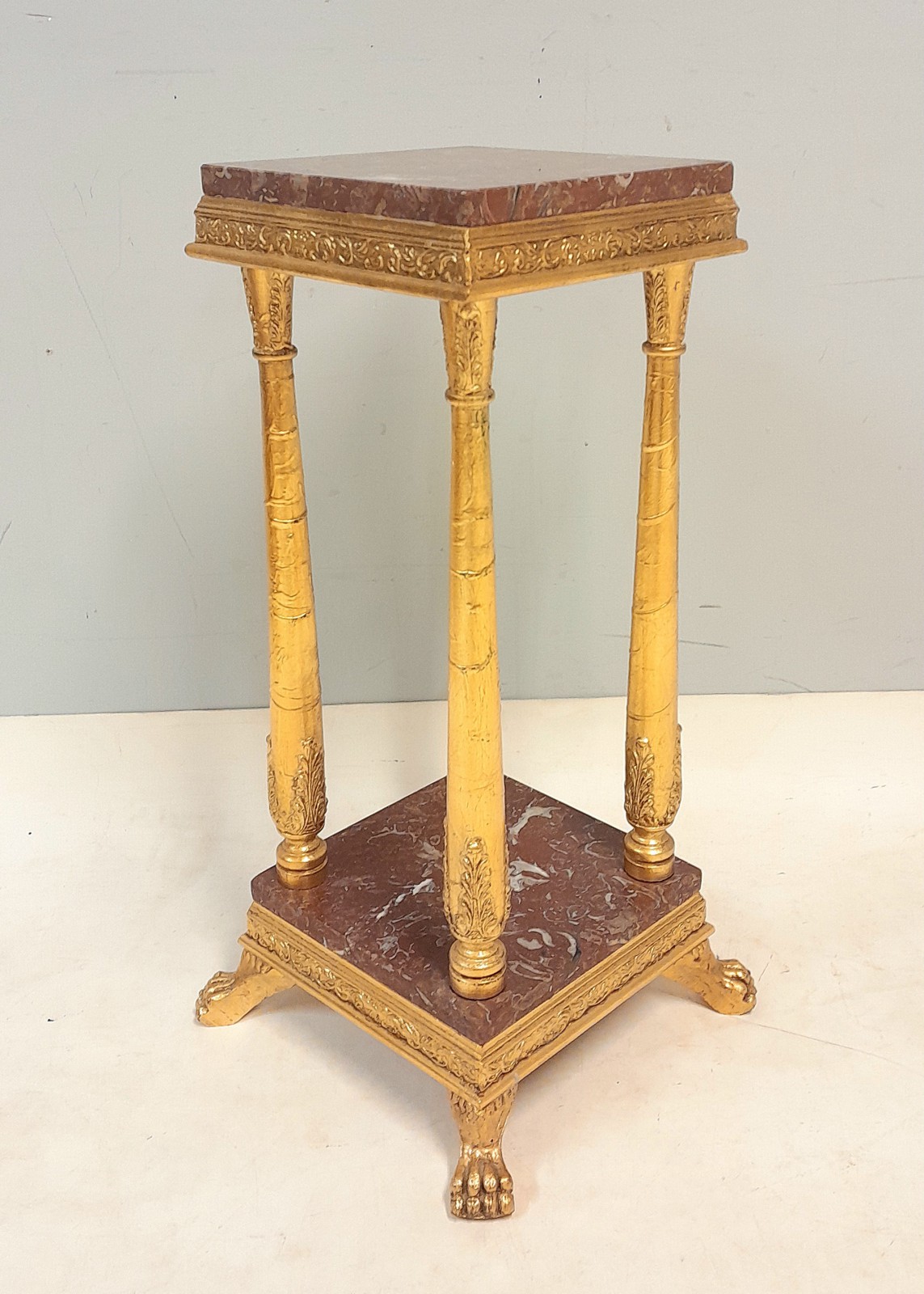 PIEDESTAL, EMPIRESTIL Förgyllt trä, stenskivor, ben med lövdekor, h 66 cm, upptill 27x27 cm Avslutas 2026-02-09 18:03:00