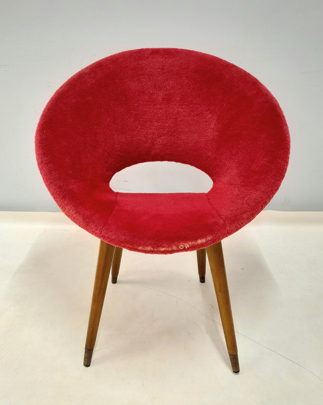 FÅTÖLJ, 1950/60-TAL Klädd i "luddig" hallonröd textil, rh 79 cm, sh 37 cm, slitage framkant och upptill Avslutas 2026-03-30 18:10:00